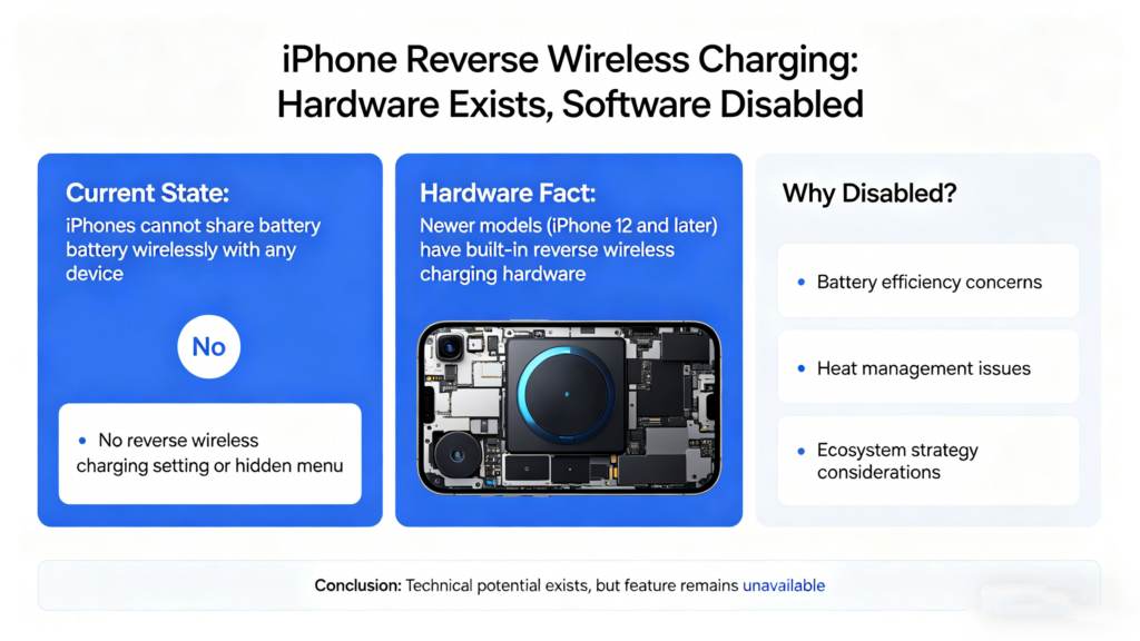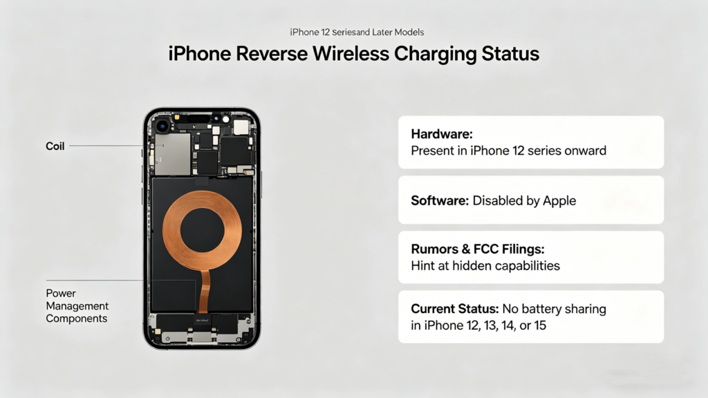iPhones from the 12 series onward include the hardware — coil and power management components — that could support reverse wireless charging, but Apple has disabled it at the software level. Despite rumors and FCC filings hinting at hidden capabilities, no iPhone 12, 13, 14, or 15 currently offers battery sharing in any form.