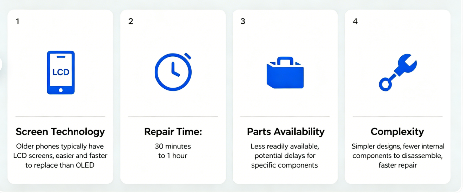 - Repair Time: Screen replacement on older devices tends to be quicker, often ranging from 30 minutes to 1 hour.