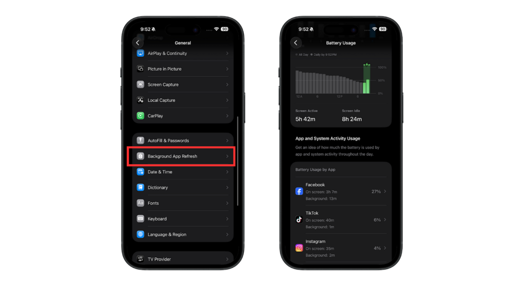 Background processes contribute significantly to daily battery consumption. To reduce unnecessary drain: