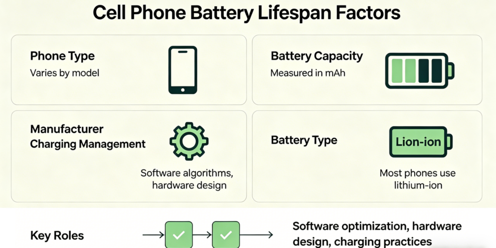 Cell phone battery lifespan varies by phone type, battery capacity, and how each manufacturer manages charging and power consumption. While most phones rely on lithium-ion batteries, software optimization, hardware design, and charging practices also play major roles in how long a phone battery lasts.