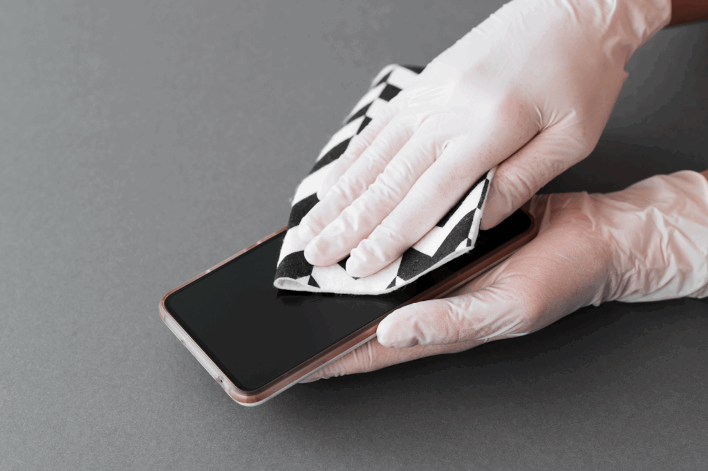 Start by gently wiping the phone screen with a microfiber cloth to remove any dirt, dust, or debris. Be cautious around sharp edges or lifting glass, as pressing too hard can worsen screen cracks. If there are any loose glass shards, use a small piece of packing tape to lift them away safely.